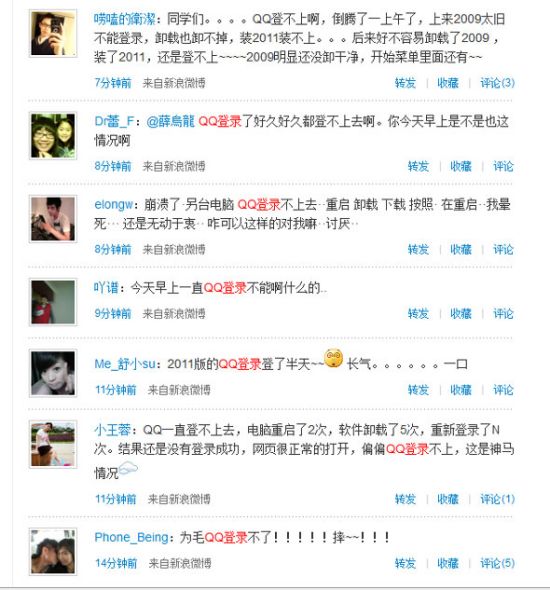 从今早10:30左右,陆续有网友在新浪微博中反映无法QQ登录,版本均指向QQ2011 Beta1。有网友表示,QQ登录不上,可以上网、听歌等,QQ就是在那左顾右盼上不了。不过,用户通过重新安装旧版QQ,或者使用WebQQ等方式,仍然可以使用腾讯提供的IM服务。