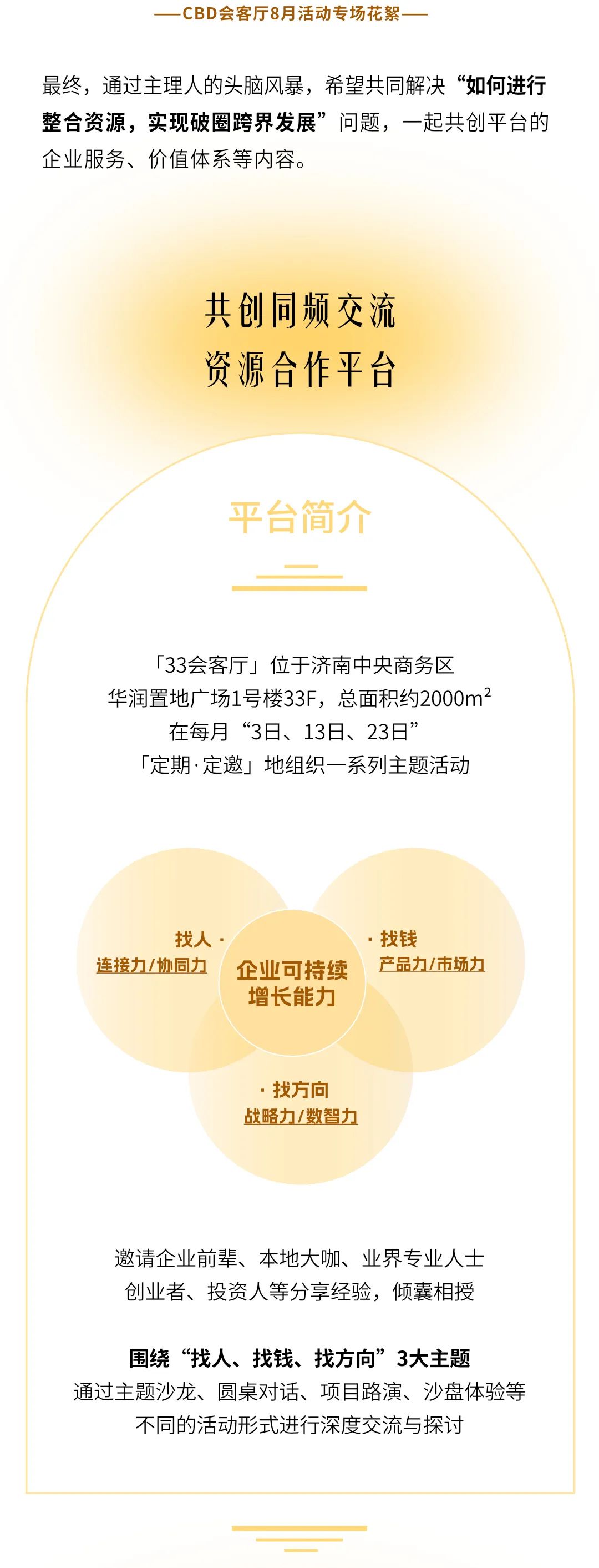 9月3日下午,济南·CBD·33会客厅汇聚来自不同行业领域的主理人,以“链接资源、产生价值”为中心,围绕搭建“信息交流”平台,展开深入探讨,共创更多内容与商业可能性。
