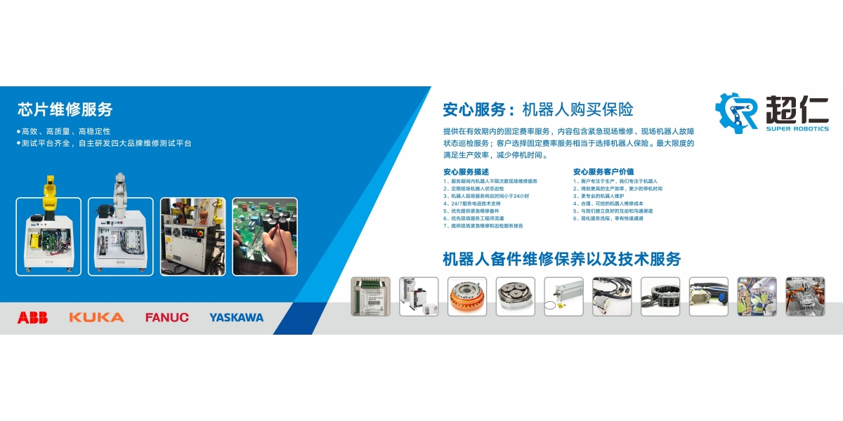首先,佛山超仁机器人科技有限公司的主营业务包括销售全新和二手ABB、FANUC、KUKA、川崎、安川等**品牌的机器人。这些机器人广泛应用于汽车制造、电子设备组装、医疗器械生产等多个行业领域,具有高精度、高效率和稳定性强的特点。公司提供的二手机器人经过严格的检测和维修,确保性能稳定,为客户提供了更经济实惠的选择。此外,公司还提供机器人所需的日常备件和维修保养服务,为客户提供***的机器人解决方案。