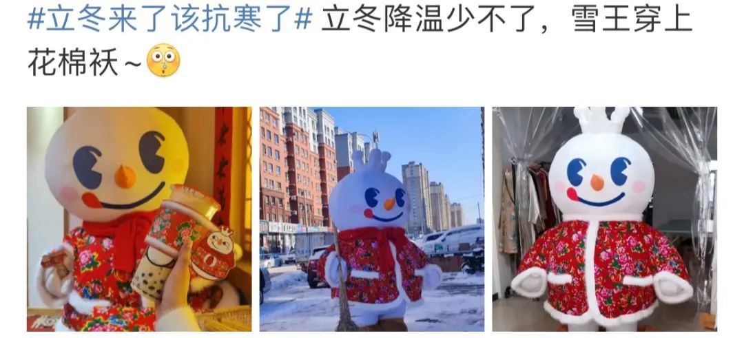 天气一降温,雪王就先人一步,穿上了东北特色大花棉袄,主打一个入乡随俗。
