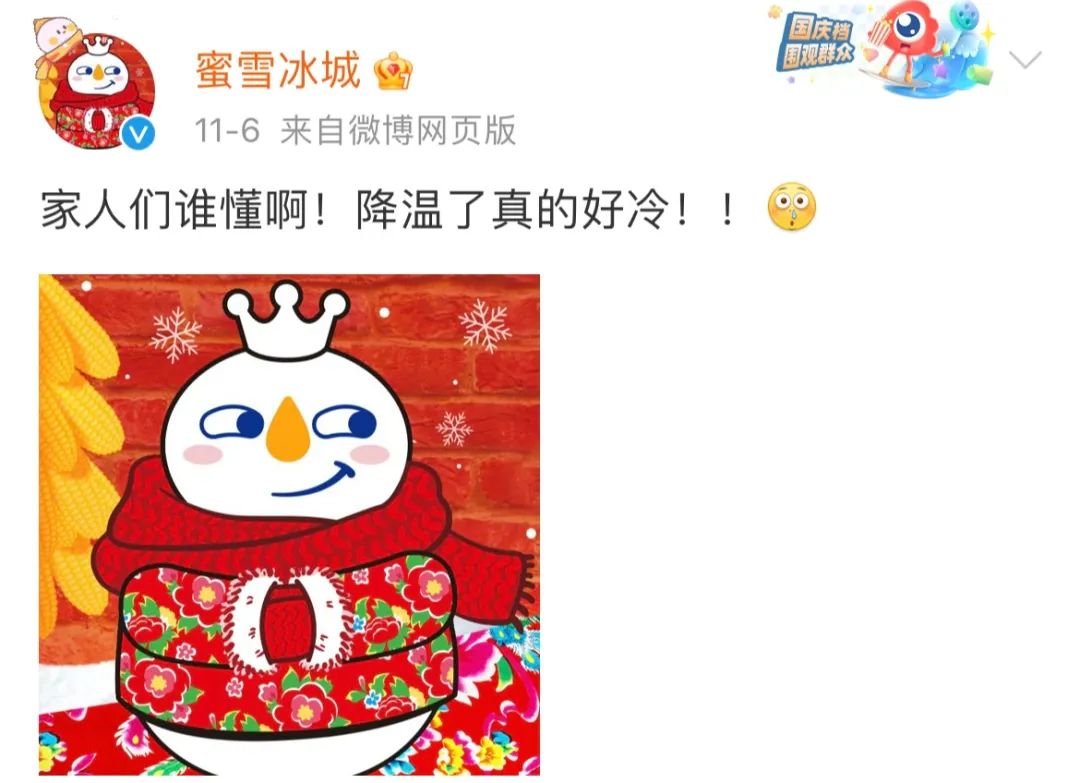 其实,这不是蜜雪冰城第1次让雪王穿上大棉袄,在去年11月份,同样给雪王穿上了大袄子,只是袄子不是极具东北特色而已。