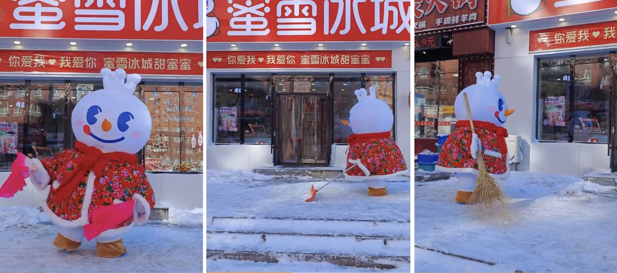就拿雪王穿东北大花棉袄举例,品牌在做这件事之前,在社交媒体平台拍摄了一个视频,视频里雪王在铲雪、扭秧歌、扫雪这些动作,都是在调动大家情绪,让大家在雪地这个场景下,能感受到雪王的快乐。