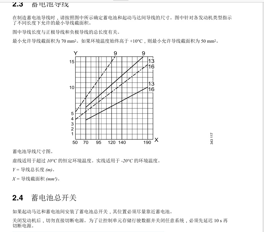 在制造蓄电池导线时,请按照图中所示确定蓄电池和起动马达间导线的尺寸。图中针对各发动机类型指示了不同长度下允许的*小导线截面积。