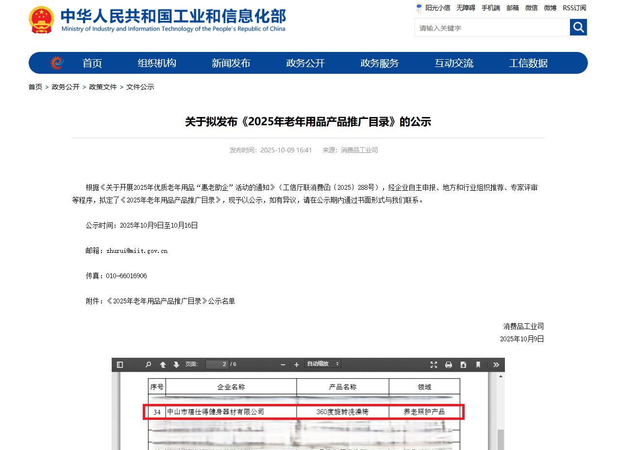 家人们!重磅喜讯来袭——福仕得360度旋转洗澡椅,成功入选中华人民共和国工业和信息化部公示的《2025年老年用品产品推广目录》!