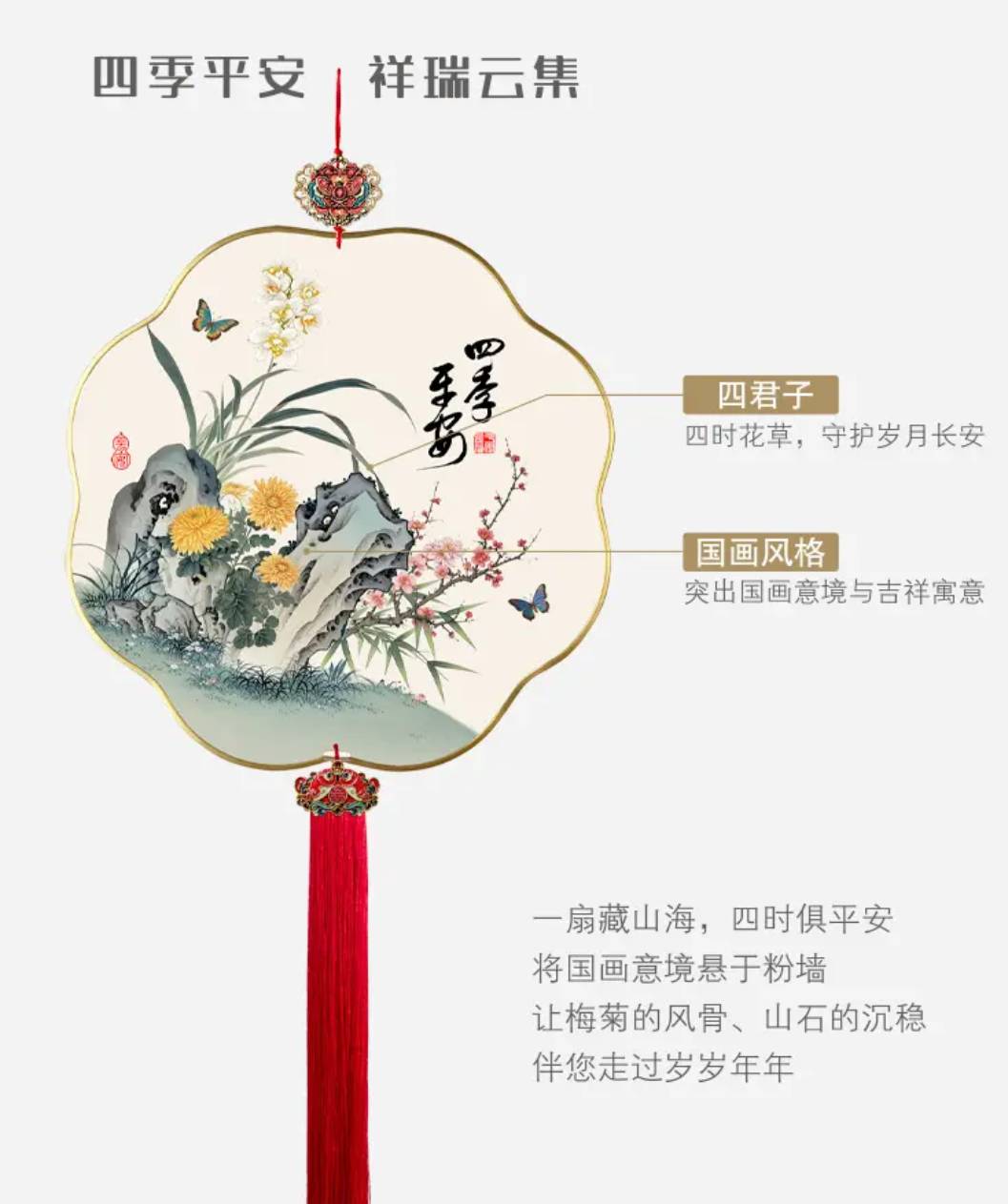 作为新中式风格的代表性产品,这款挂件在设计上深度挖掘传统文化内核,实现 “传统符号现代化” 的创新表达。在画面元素上,挂件以 “四季” 为时间脉络,巧妙融入松、竹、梅、兰、荷、菊等象征四季流转的植物纹样,搭配祥云、仙鹤、蝙蝠等传统祥瑞符号 —— 仙鹤立于松枝,寓意长寿安康;蝙蝠衔祥云环绕,取 “福运临门” 之谐音;四季花木交错生长,既展现自然生机,又暗合 “四季平安、岁岁无忧” 的美好祈愿。整体画面摒弃传统吉祥图案的繁复感,以简约流畅的线条、清雅雅致的色彩(主推墨绿、赭石、米白等新中式经典色系),适配现代家居的多元化装修风格,无论是原木风、轻奢风,还是新中式家装,都能自然融入,不显突兀。设计团队负责人表示:“我们希望这款挂件不只是一件装饰品,更是家庭文化的载体。新中式风格的**是‘取传统之韵,塑现代之形’,我们通过提炼传统吉祥符号的精髓,用现代人能接受的审美语言重新诠释,让年轻人也能感受到传统文化的魅力,让‘四季平安’的祝福真正走进每个家庭的日常生活。”