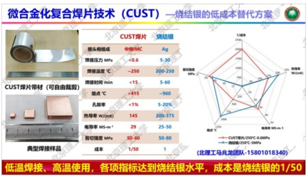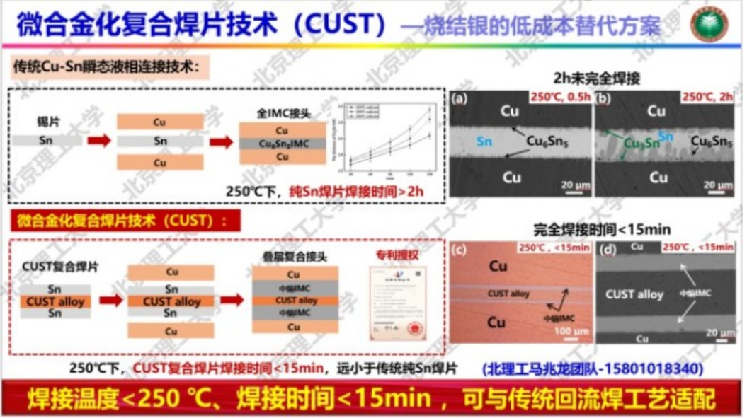 为了解决这些问题,北京理工大学的马兆龙团队开发了一种获得ZL的微掺杂复合焊料(CUST)技术,提供了一种创新的解决方案。CUST采用独特的复合层压结构:纯锡层、CUST微合金层、纯锡层,串联排列。CUST 合金中的各种元素有助于形成具有中等熵的新型金属间化合物 (IMC),从而显着加速其生长动力学。这将形成完整 IMC 连接所需的时间从传统工艺中的两个多小时缩短到不到 15 分钟,效率提高了 8 倍以上。这使得CUST焊片成为传统回流焊工艺的理想选择,提高了生产效率。