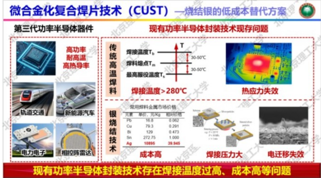 传统高温焊料(包括高铅和无铅焊料)封装技术是实现芯片与基板连接的主流工艺之一,但其焊接温度通常需超过280℃,不仅不适用于对温度敏感的器件,还会引入较大热应力,影响器件的长期可靠性。为克服这一局限,银烧结技术利用纳米银膏在较低温 度下实现连接,形成的烧结层熔点高,可实现“低温连接、高温服役”。然而,该技术存在两大推广障碍:一是银作为贵金属成本高昂,显著提高器件材料成本;二是烧结过程需施加高压(可达30MPa级别),不仅增加工艺复杂度,还对设备和芯片的机械强度提出更高要求。此外,银在电场作用下易发生电迁移,可能导致器件短路失效。