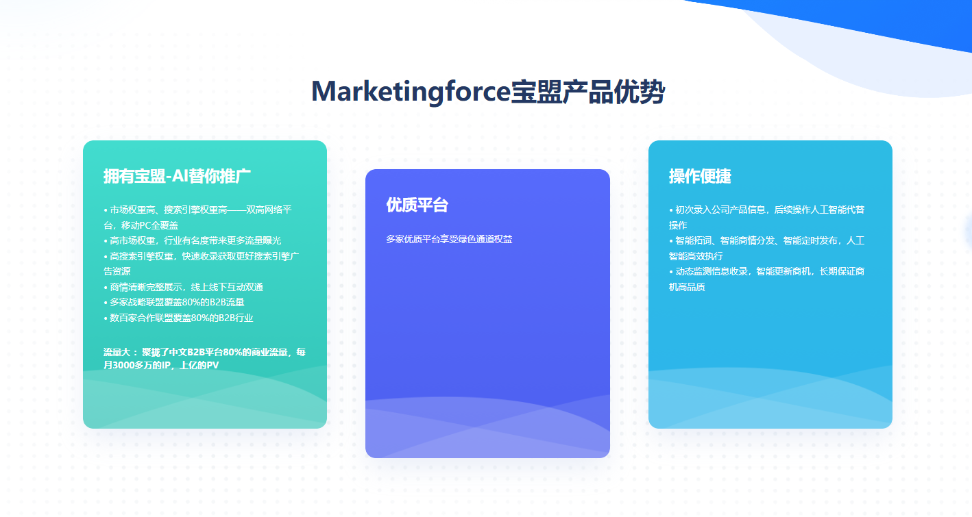 在流量与权重优势上,宝盟更是表现突出。其依托多家战略联盟与合作平台,,为企业搭建起 “广覆盖、高准确” 的流量池。合作平台均为市场权重高、行业度广的站点,且移动端与 PC 端全覆盖;同时,这些平台的高搜索引擎权重能让企业产品相关关键词快速被收录,在搜索结果中排名靠前,轻松获取流量资源。此外,宝盟还为企业提供 “结果可视化” 服务,发布内容与推广效果一一对应,企业可随时查看动态。