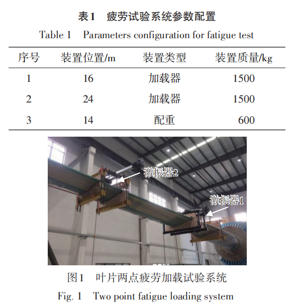 叶片根部固定在加载基座上,2 台电驱动疲劳 加载惯性激振器通过木芯及夹具安装于叶片上,激 振装备安装距离根部距离分别为 16 和 24 m,两点 位置的激振器可同时给叶片提供交变激振力。在 叶片展向不同位置上设置配重来调整载荷分布,得 到各剖面位置所需的载荷。因此,建立仿真模型对 载荷匹配优化,并校验配重块的质量和数量,得到 沿叶片展向的弯矩分布误差小于 7%。两点疲劳加 载系统参数采用表 1 中的数据配置,疲劳试验系统 如图 1 所示。