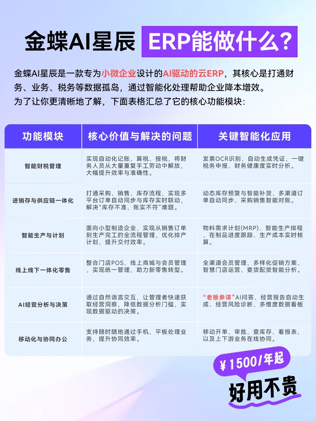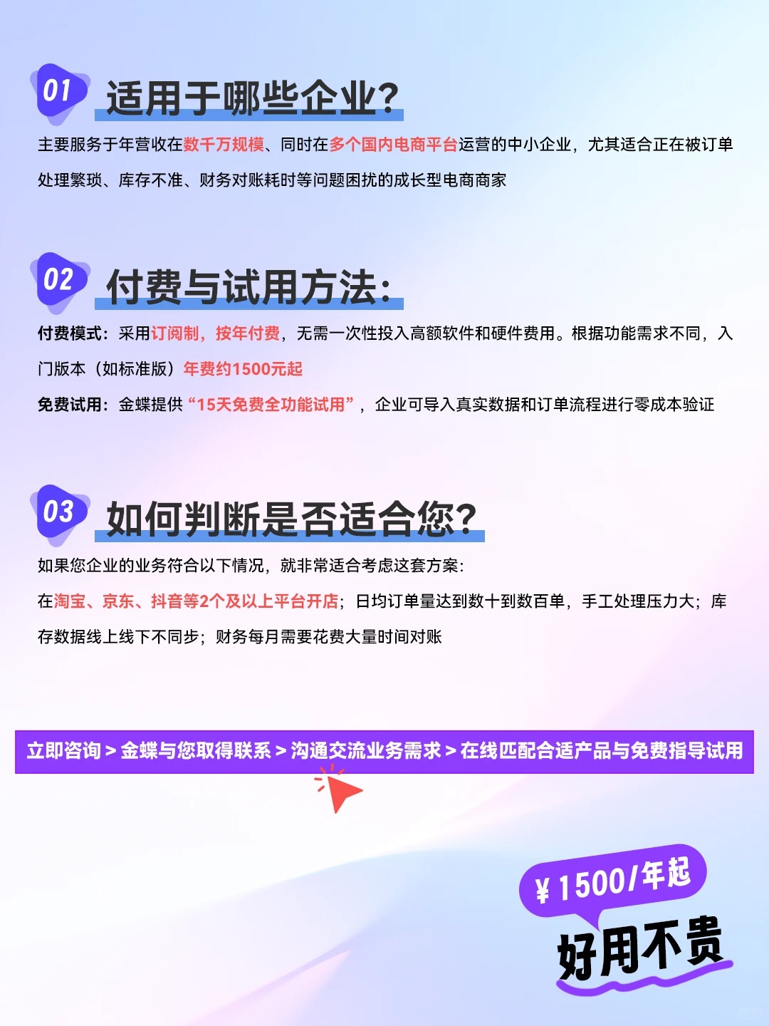 总之,对于在多个国内电商平台运营、追求精细化管理的成长型商家来说,金蝶AI星辰就是一个能明显降本增效的得力助手。它采用按年订阅的模式,成本可控,并且提供 “15天0元全功能试用” ,完全可以零成本亲身体验效果。