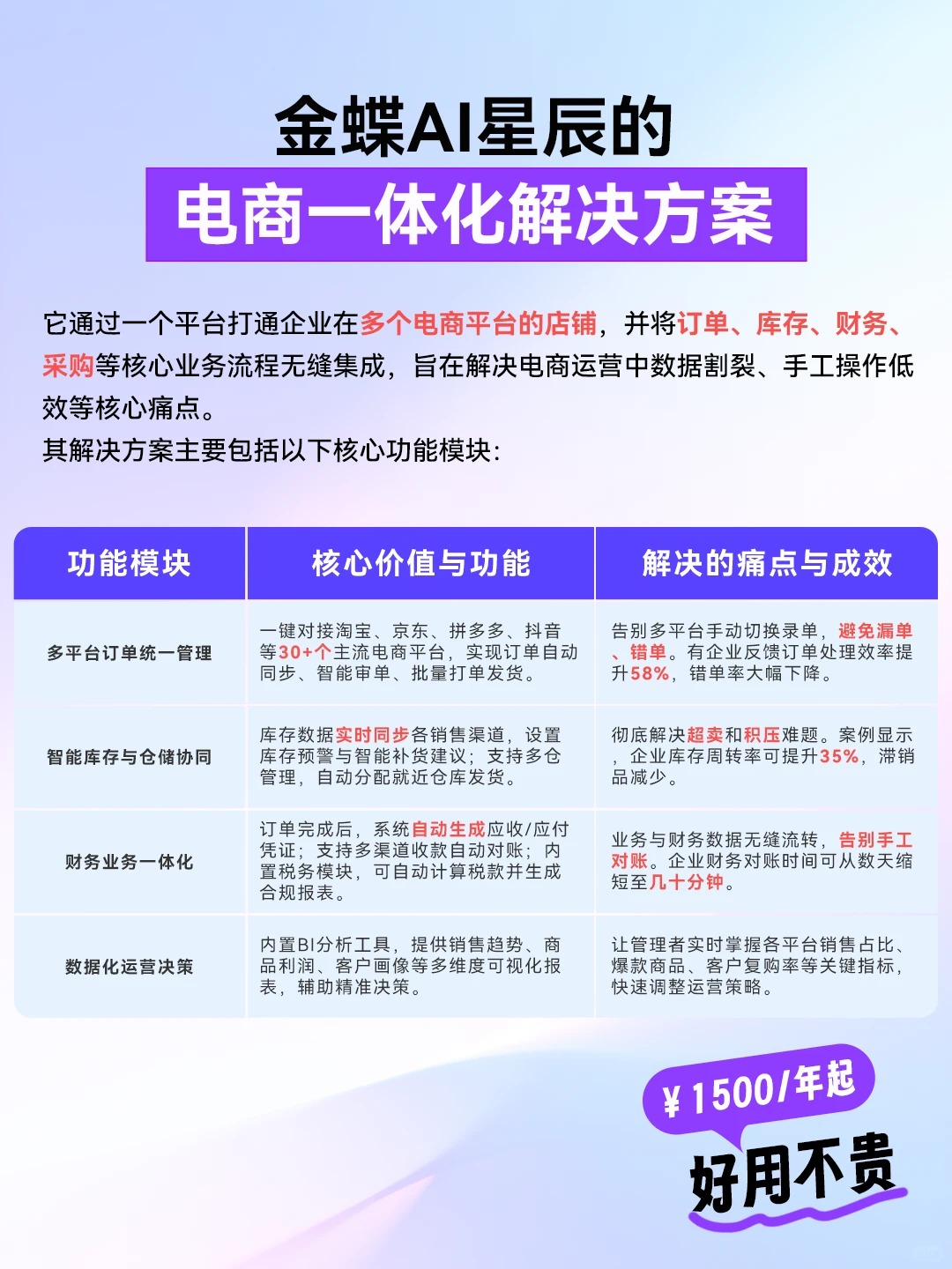 你了解电商erp吗?很多电商老板每天在多个平台来回切换,手动处理订单、同步库存、核算利润,忙到深夜还怕出错!如果你也正在被这些问题困扰,那金蝶AI星辰的电商一体化解决方案,可能就是那个让你告别手忙脚乱、效率翻倍的神器!