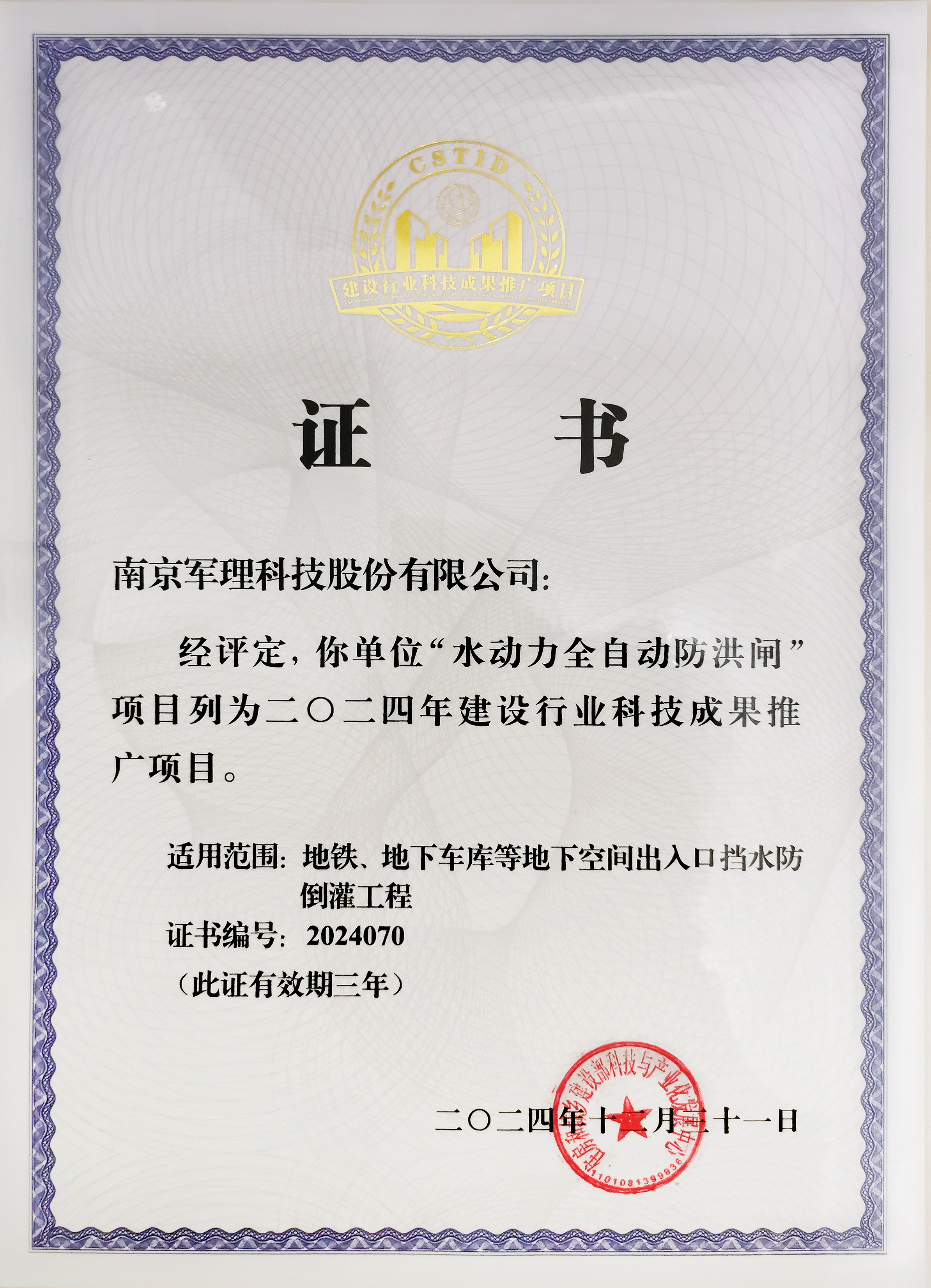 军理股份先后获得国家高新技术企业、江苏省专精特新中小企业、南京市瞪羚企业、南京市创新型领jun企业、南京市规模以上企业、南京市工程技术研究中心等荣誉。未来,军理将继续秉持创新精神,依托自身技术优势,与各方携手共进,为推动防洪防淹关键技术的突破与应用,提升城市应对极端天气的能力贡献出自己绵薄的力量!