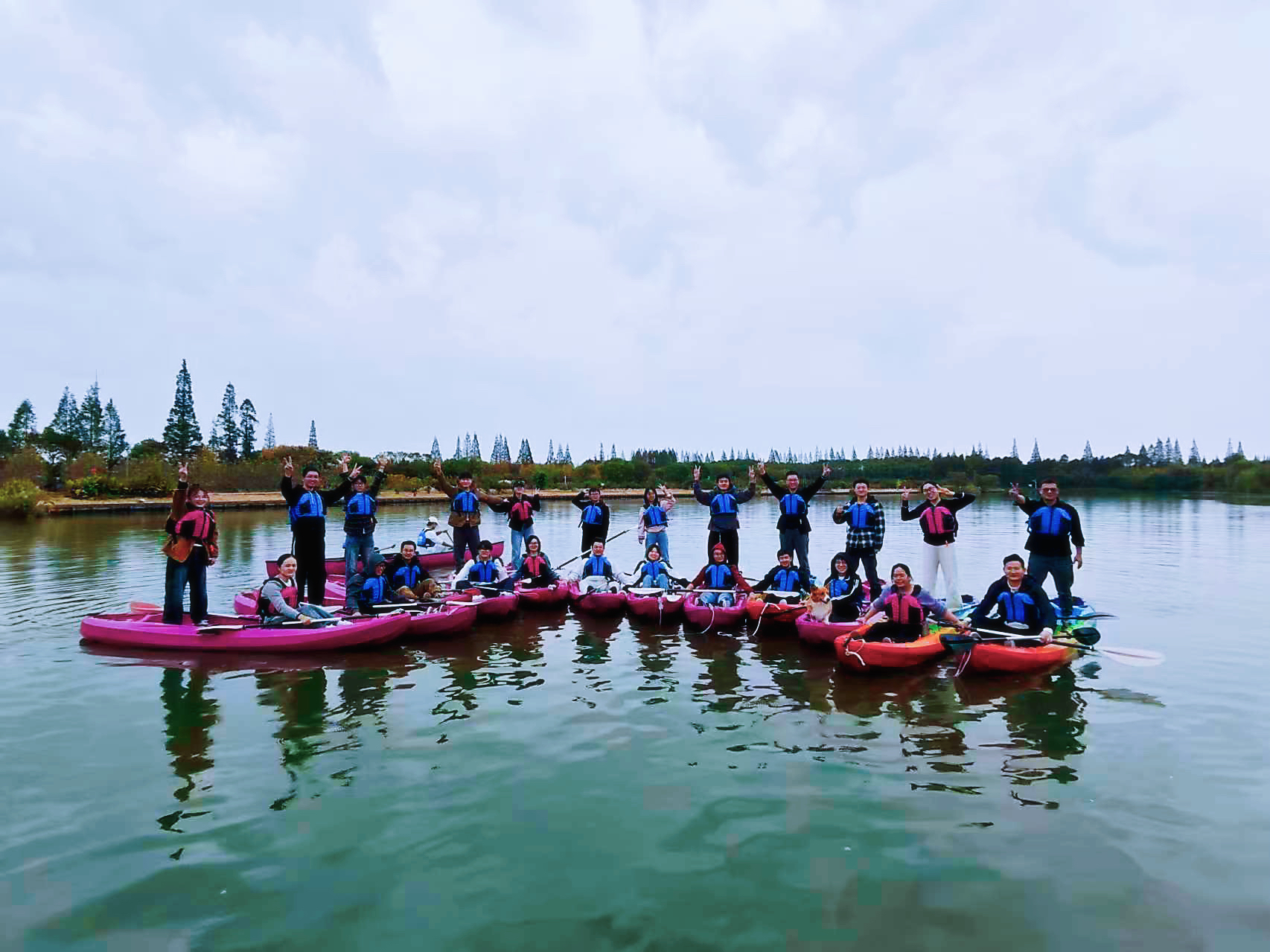 午餐休整过后,重头戏来啦!湖面皮划艇游戏正式开启~同样教练先指导如何试用划桨,随后两两一组结对出发,刚开始还有点手忙脚乱,湖面上飘荡着:“左右!左右!要撞啦!”从慢慢摸索节奏到默契配合,有的组专注竞速,有的组佛系赏景。一共两个湖面,皮划艇玩完一圈差不多1个小时,天空开始飘起了绵绵细雨,我们转战到了室内!