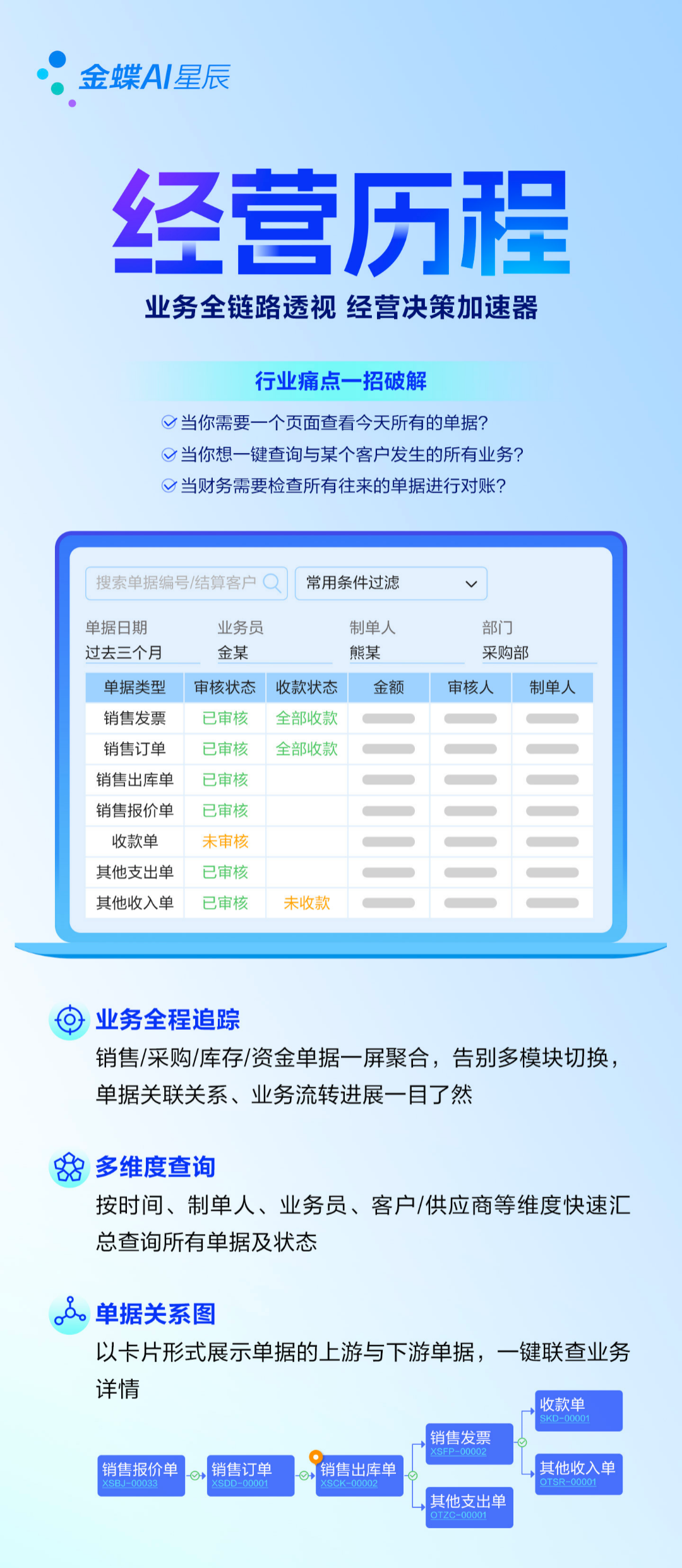 企业日常经营中,常面临单据分散难查、业务链路追踪不畅、财务对账繁琐等痛点 —— 这些问题不仅消耗人力,更可能拖慢决策节奏。针对此类行业共性需求,金蝶 AI 星辰推出 “经营历程” 功能,以业务全链路穿透查看,成为企业经营决策的高效加速器。