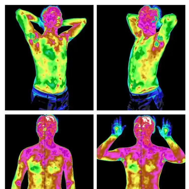 红外热像仪可以将人体辐射的远红外光波通过一系列聚集调制转换,经多媒体图像处理技术,以伪彩色形式,显示人体的温度场。