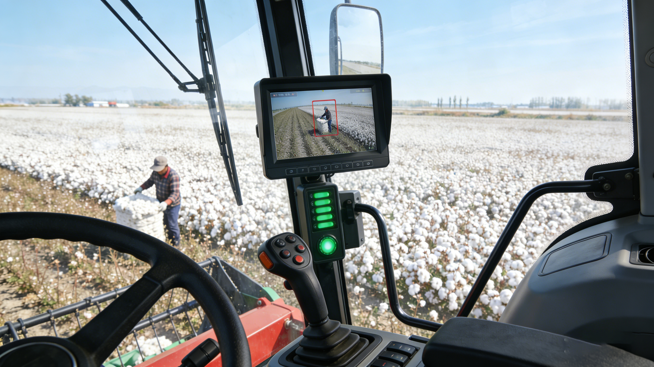 功能设计上,系统深度贴合棉花采收全流程。“盲区动态预警”功能可实时标注安全范围,当障碍物进入预警区域时,驾驶室内10.1寸触控屏即通过驾驶台触控屏标注风险位置、同步语音播报,并触发声光报警,还可选配毫米级雷达探测,清晰探测障碍物距离。超星光夜视技术支持0.001Lux微光环境成像,满足昼夜连续作业需求。某农机合作社反馈,应用该系统后,采棉机碰撞事故下降75%,漏采率从22%降至4%,单日采收面积从300亩提升至405亩,效率提升35%。