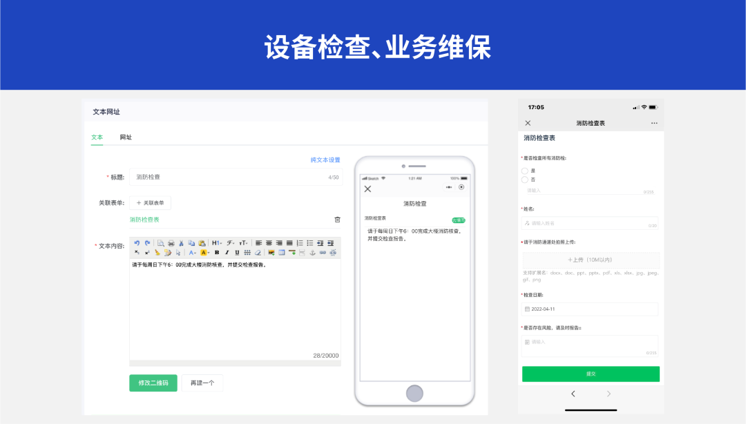 在传统的制造业,特别是有大量器械需要进行检修维保的场景,以往维保人员都是拿着一沓硬币厚的文档,进行维修记录等,这样的场景还有很多,比如消防检查、设备信息登记等。