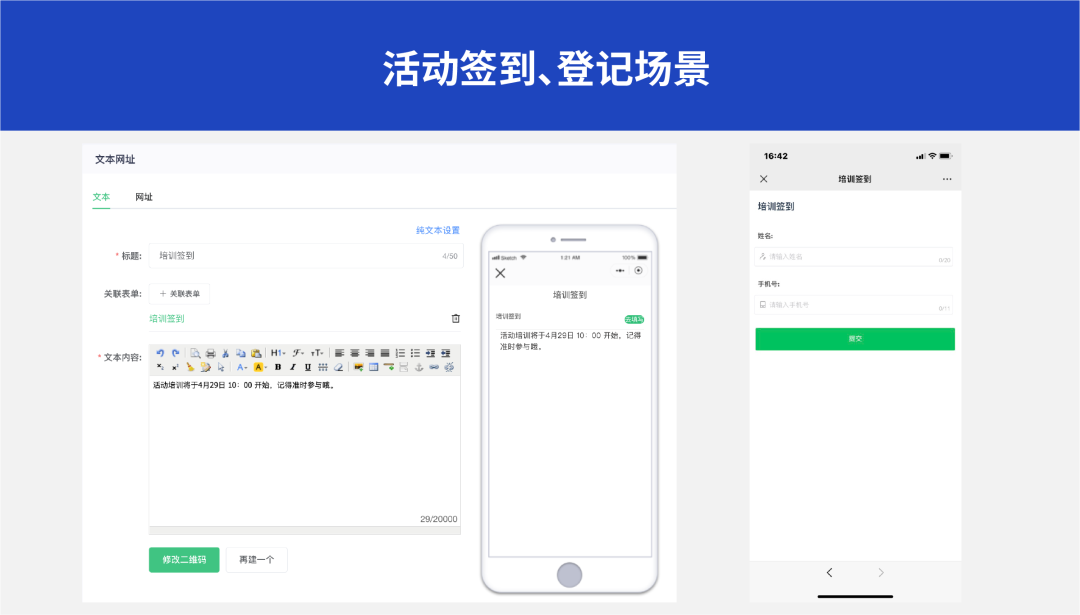企业以往线下举行活动,在来访签到、活动报名、预约登记等场景下,都需要进行纸质签字,如果参与人多的话,不仅效率低,还浪费了大量的纸张。尤其是在**管控下,扫码签到可以减少不必要的接触,数字化的管理,人性又高效。