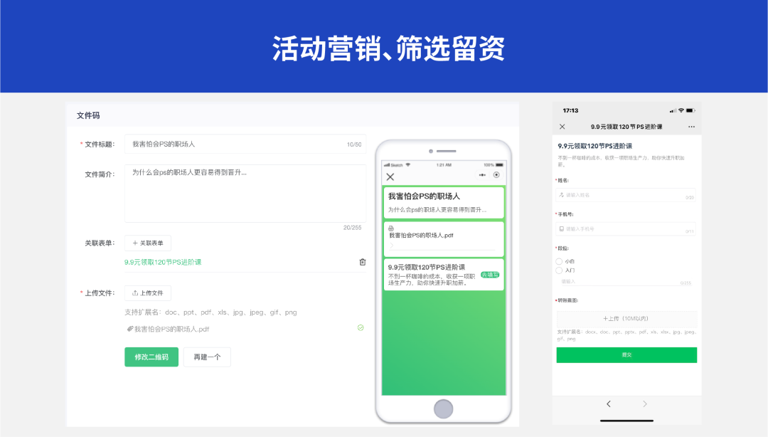 那么我们简单为大家演示一下,如何应用文件码+表单发起一场营销活动。