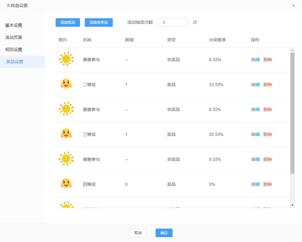 中奖概率主要面向用户群体,设置好活动抽取次数后添加中奖次数,系统会根据奖品数和抽取次数自动计算中奖率及对应的非中奖率。