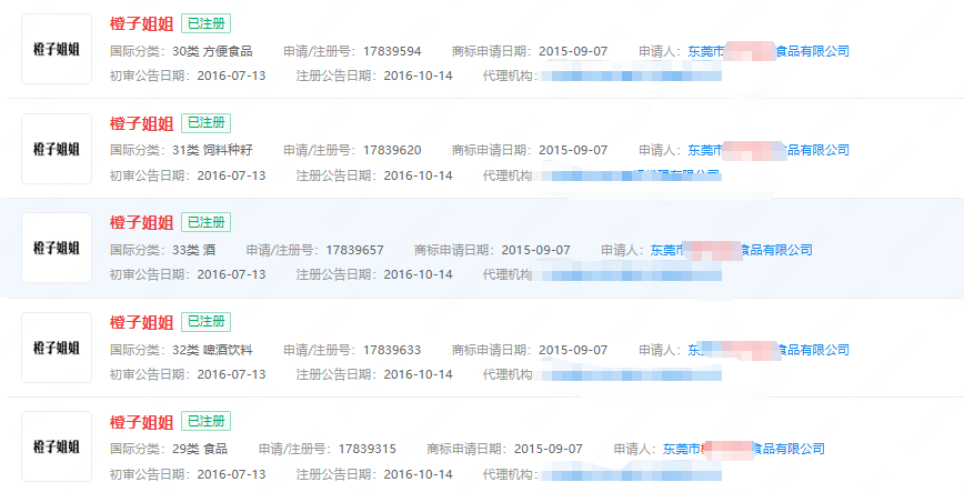 类似的案例还有橙子姐姐。该网红于2023年崭露头角,但“橙子姐姐”商标早在2015年就被多家公司申请注册。
