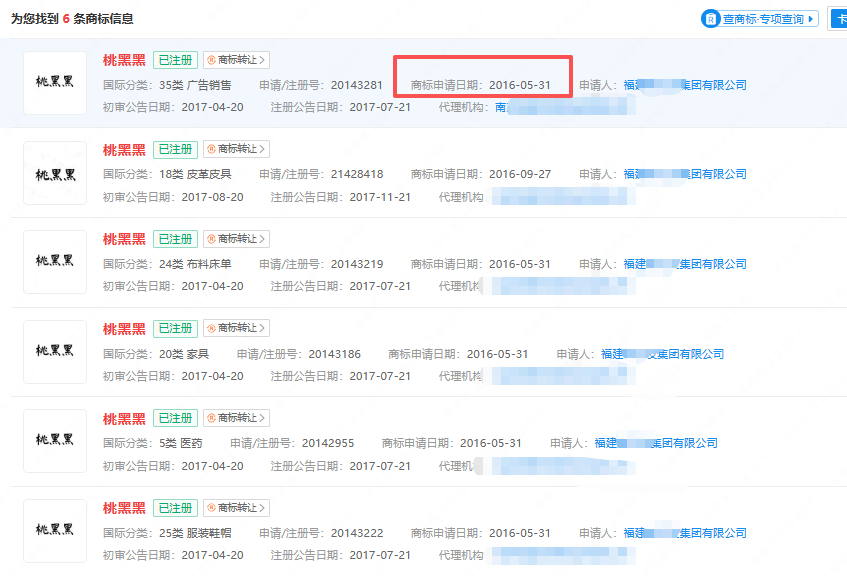 近期,千万粉丝博主桃黑黑陷入争议,有传言称其艺名商标遭他人抢注。但经查询发现:福建某公司早在2016年就申请了“桃黑黑”商标,而该网红直到2018年才出现在公众视野。