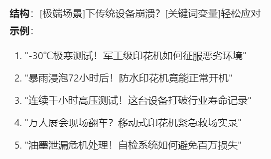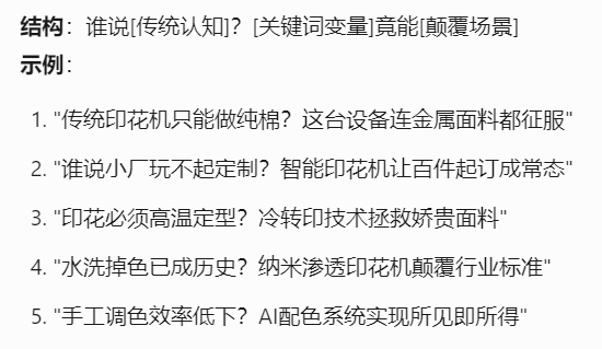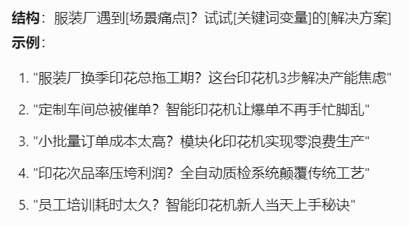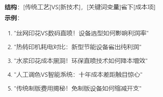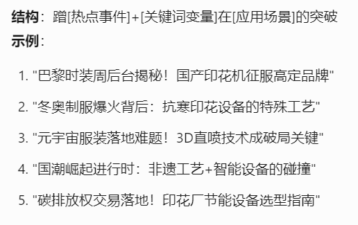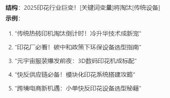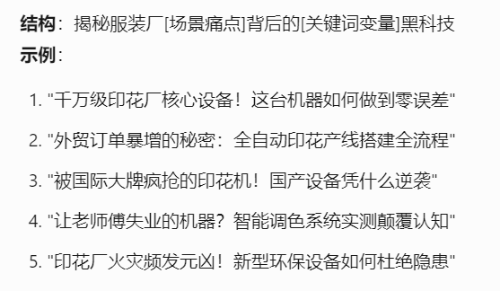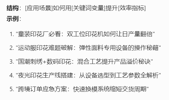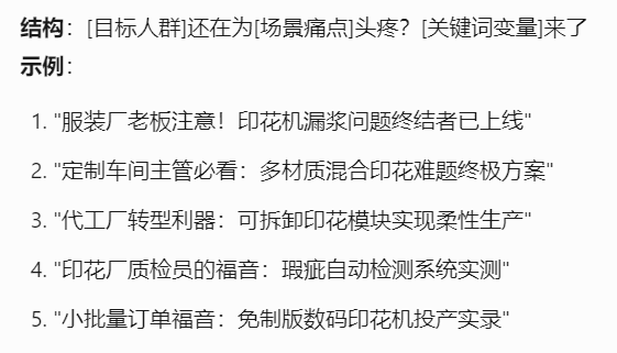 以下是Tforce营销助手生成的印花机爆款选题公式和示例,结合了产品关键词和业务场景,制造业企业的选题方式是可以复用的。