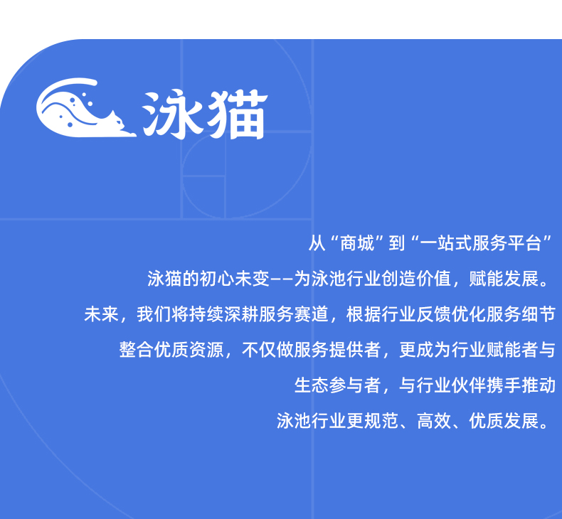 从“商城”到“一站式服务平台”,泳猫的初心未变——为泳池行业创造价值,赋能发展。未来,我们将持续深耕服务赛道,根据行业反馈优化服务细节,整合质量资源,不仅做服务提供者,更成为行业赋能者与生态参与者,与行业伙伴携手推动泳池行业更规范、高效、质量发展。