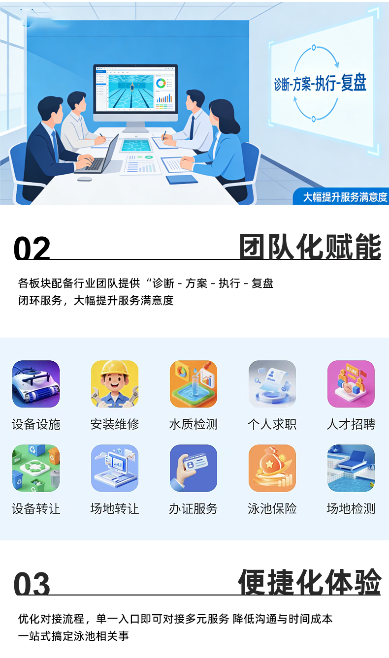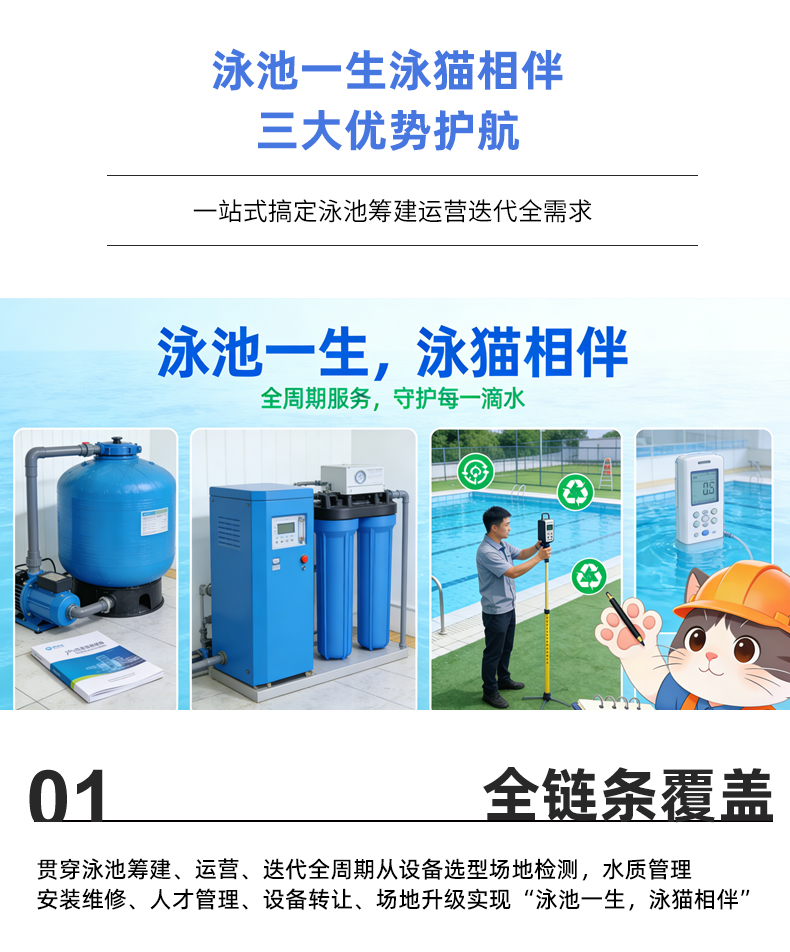 此次升级以“服务为核,客户为本”,新平台具备三大优势:一是全链条覆盖,从泳池筹建期的设备选型、场地检测,到运营期水质管理、安装维修、人才管理,再到迭代期的设备转让、场地升级,真正做到“泳池一生,泳猫相伴”;二是专业化赋能,各板块配备团队,提供“诊断-方案-执行-复盘”闭环服务,服务大幅提升;三是便捷化体验,优化对接流程,单一入口即可对接多元服务,大幅降低沟通与时间成本,真正实现“一站式搞定泳池相关事”。