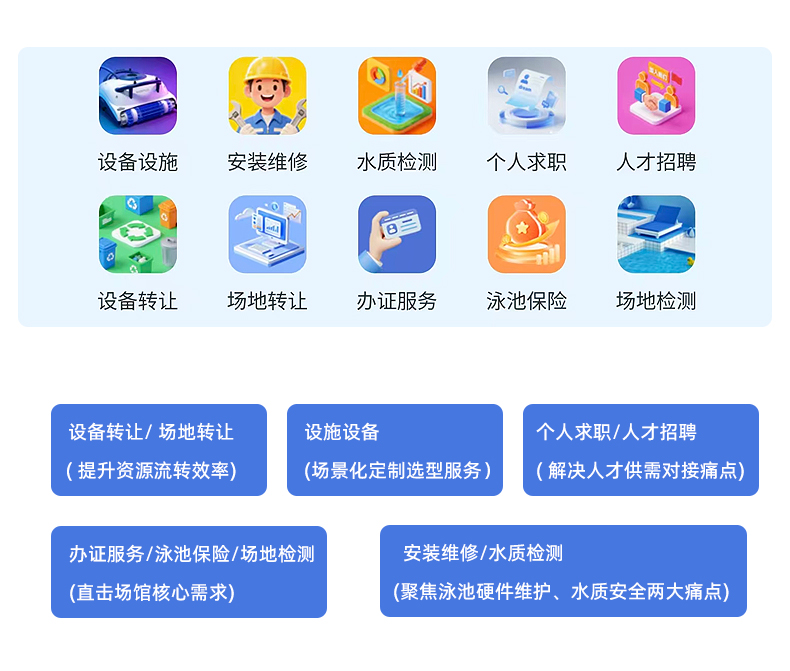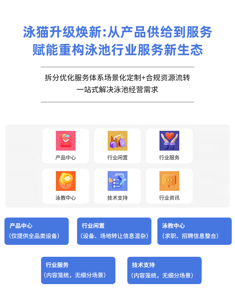 泳猫商城此前以产品中心、行业闲置、行业服务、泳教中心、技术支持、行业资讯六大板块为基础,为泳池从业者搭建了供需对接桥梁,但随着市场、需求及行业的快速变化,泳池场馆运营者、创业者、从业者的需求愈发多元精细,原有粗放的板块划分已无法满足这些需求,为此泳猫启动升级,拆分优化服务体系以提升服务针对性,升级后的平台服务能力大幅提升,形成服务板块与实时更新的行业资讯板块,实现从“产品供给”到“服务赋能”的转变,具体升级如下:原“产品中心”升级为“设施设备”板块,除全品类设备外,新增场景化定制选型服务,适配商业、亲子、别墅等各类泳池;原“行业闲置”拆分为“设备转让”与“场地转让”,搭建合规的交易渠道,提升资源流转效率;原“泳教中心”拆分为“个人求职”和“人才招聘”;原“行业服务”拆分为“办证服务”“泳池保险”“场地检测”;原“技术支持”并拆分为“安装维修”和“水质检测”,每一项都聚焦各类痛点。