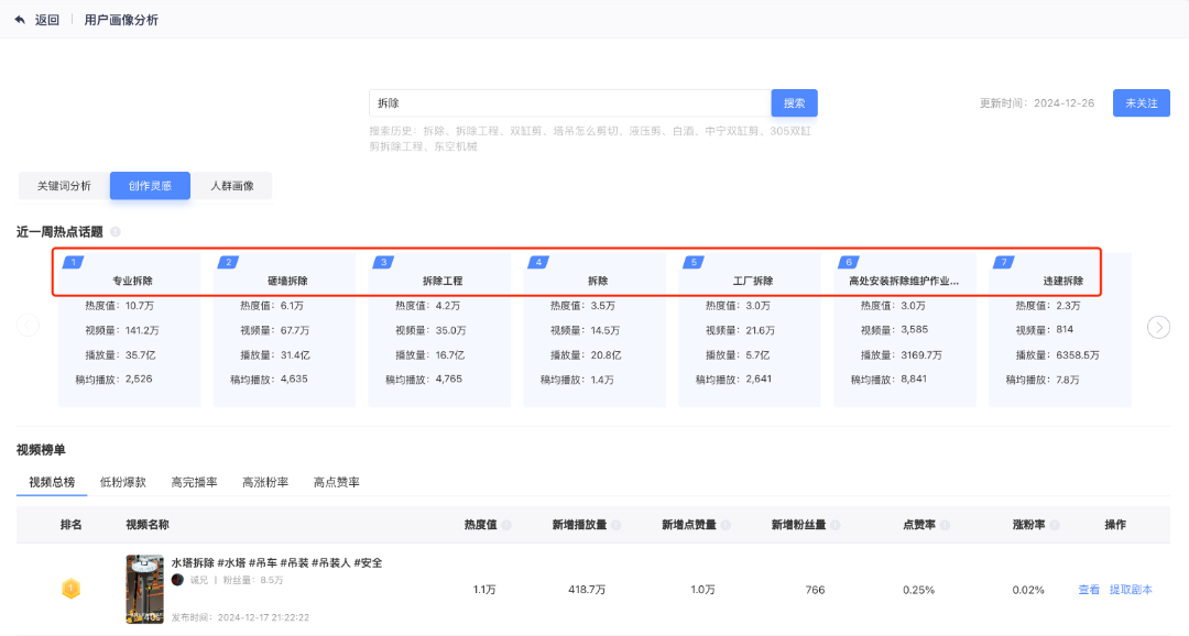 在关键词选择上,我们可以用【视频魔方】的“关键词工具”,查询某一关键词后,从用户画像分析,关键词分析中,获取到【近一周热点话题】的相关数据,再从中选择相关热门话题,作为目标关键词。