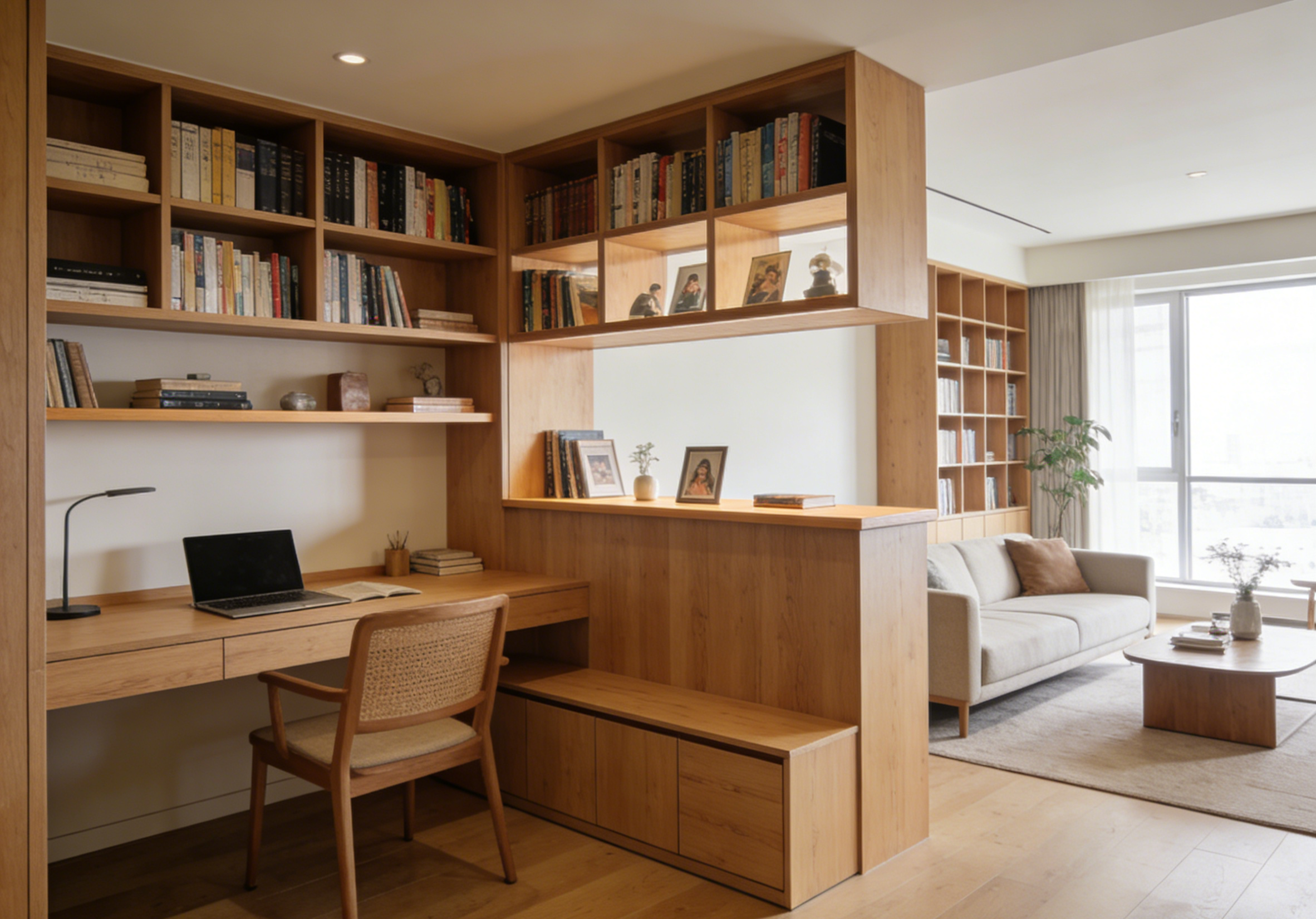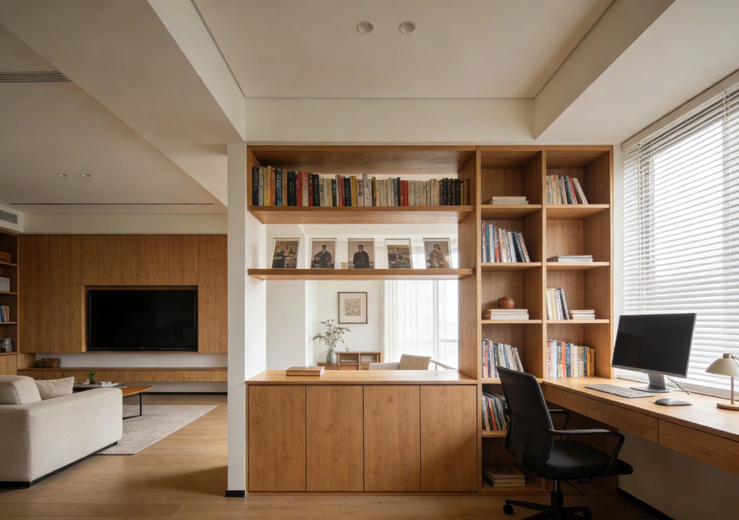空间融合是开放式书房的主要,设计时需兼顾通透感与功能边界。建议采用无隔断设计,让书房与客厅、餐厅等空间自然衔接,提升整体空间采光与通透度。可利用原木色置物架、矮柜作为隐形分隔,既划分功能区域,又避免视觉堵塞。比如在客厅与书房过渡处设置半高原木书柜,上层藏书、下层作为展示台,兼顾收纳与装饰功能,让空间过渡更自然。