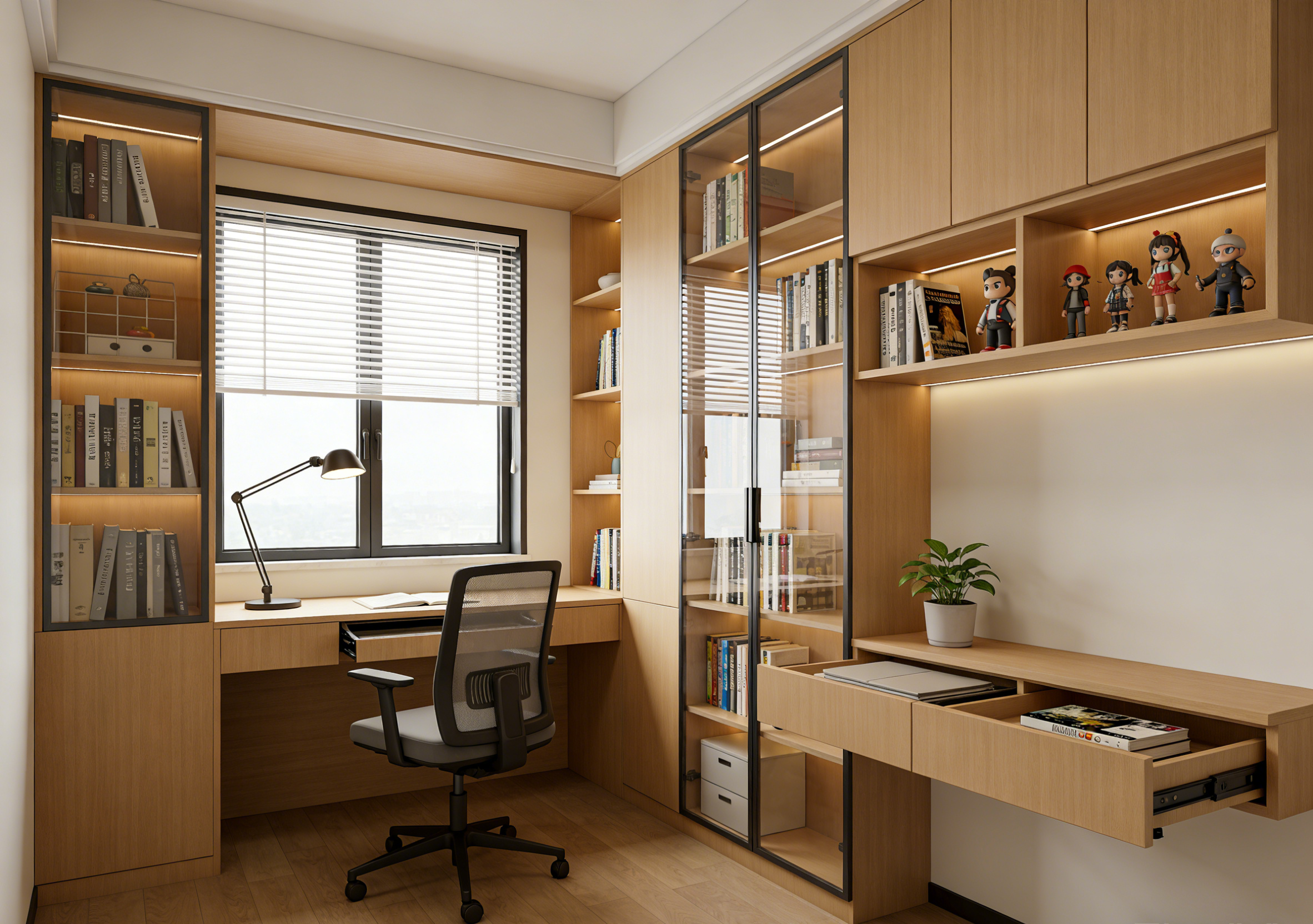 功能布局要兼顾实用性与灵活性。书桌位置建议靠近窗户,利用自然采光减少眼部疲劳,同时搭配可调节护眼台灯,满足夜间使用需求。收纳设计遵循“藏八露二”原则,封闭柜体用于存放杂物、书籍,开放格架展示手办、绿植等装饰品,兼顾收纳与美观。若空间有限,可设计折叠书桌或壁式书桌,不用时收起,提升空间利用率。