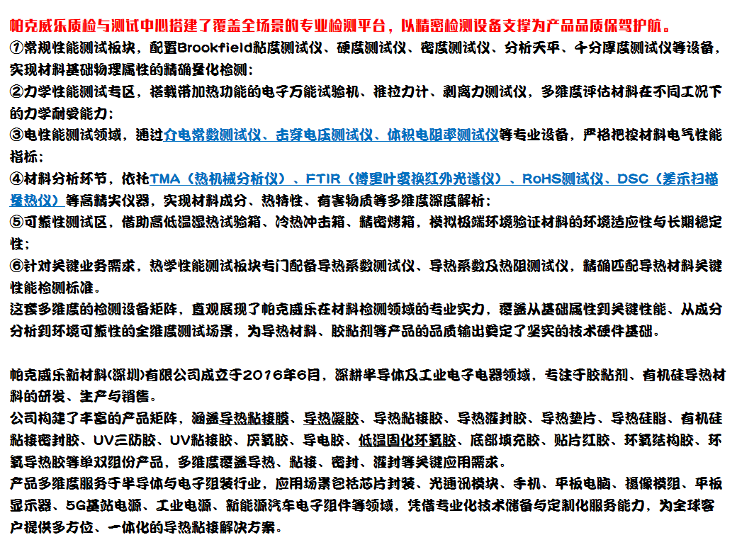 机器人蹦迪的欢乐背后,是导热粘接服务商的技术沉淀。帕克威乐作为兼具导热材料厂家实力的服务商,用导热材料、导热粘接膜、导热胶等全品类产品,不仅护航各种经济,更赋能汽车胶、AI设备胶等多领域发展。