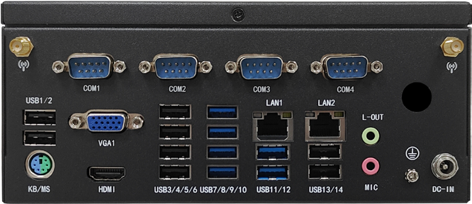 接口配置:网口(2 个千兆网口)、显示接口(1 个 VGA+1 个 HDMI)、USB 接口(14 个,含 6 个 USB3.0+8 个 USB2.0,兼顾高速传输与多设备连接)、串口(8 个,均为 RS232 模式)、音频接口(1 组 Line out/Mic in/Line in 插孔)、PS2 接口(1 个二合一接口),同时预留 2 个 WIFI 天线端子;
