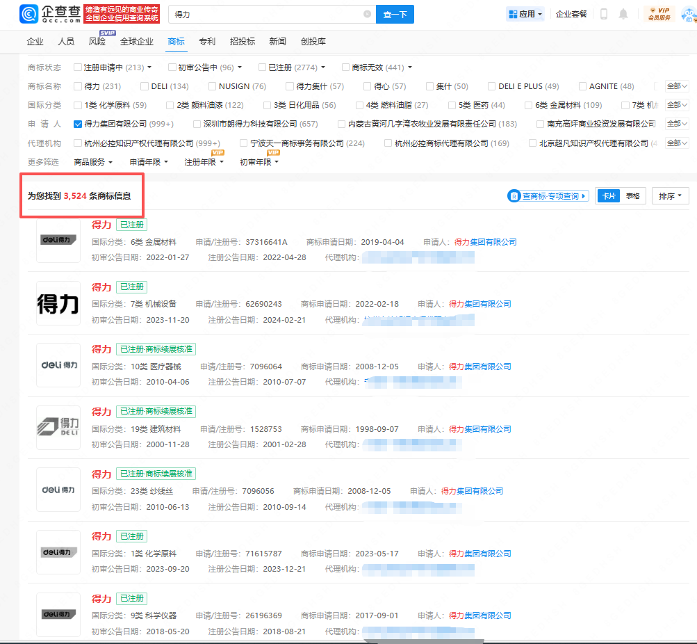 得力集团拥有超3000件商标,覆盖45个全类别,早在1995年就开始注册**商标。