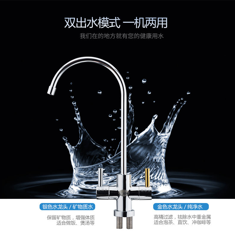 亮点二:使用双水双模系统,一个水龙头两个出水模式,种是净水系统,3级净化,水流大,方便洗菜做饭、煲汤等;另一个种是纯水系统,采用5级净化,水流小一点,但净化精度高,适合直饮和泡茶。