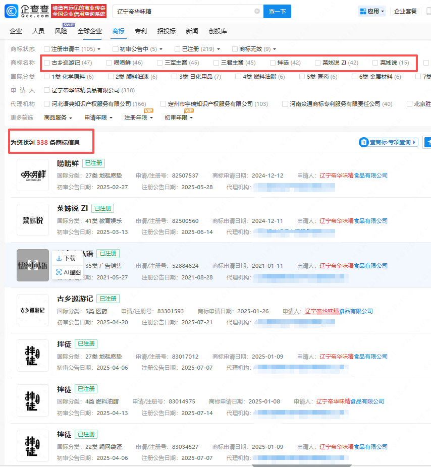 佐香园的关联公司主要包括葫芦岛佐香园食品有限公司和辽宁帝华味精食品有限公司。其中,辽宁帝华公司名下拥有338枚商标,覆盖旗下产品如“唠唠鲜”、“三军主酱”、“菜姊说”等,并实现了全类别注册,构建了基础保护网。