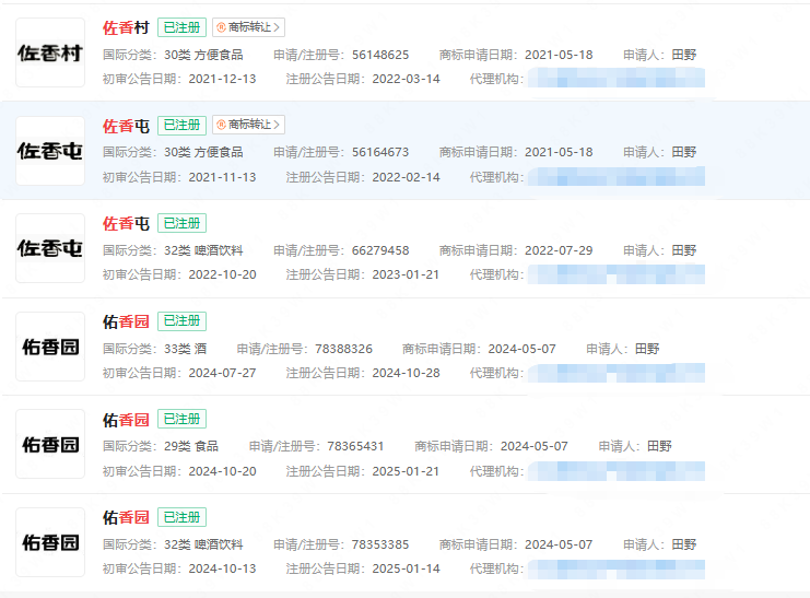 申请了防御性商标如“香佐园”全类别,以及“佐香屯”、“佐香村”、“佑香园”等关键类别,形成包围式保护。