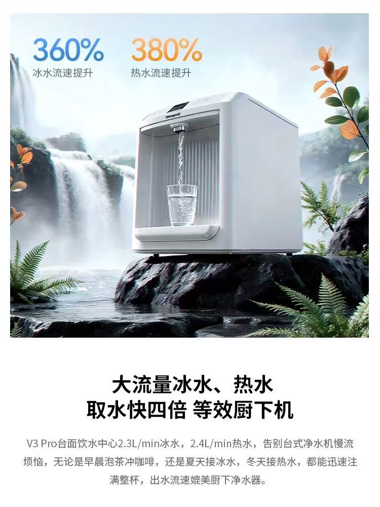 其**优势首先体现在大流量出水效率:该机型冰水流量达 2.3L/min、热水流量达 2.4L/min,较传统台式净水机,冰水流速提升 360%、热水流速提升 380%,取水速度相当于传统机型的四倍,与厨下净水器流速持平。无论是晨间泡茶冲咖啡,还是夏季接冰水、冬季接热水,都能快速注满整杯,告别长时间等待的困扰;同时配备 3.3L/min 的澎湃常温水,即滤即饮的设计,也能应对家庭用水高峰,避免 “抢水” 尴尬。