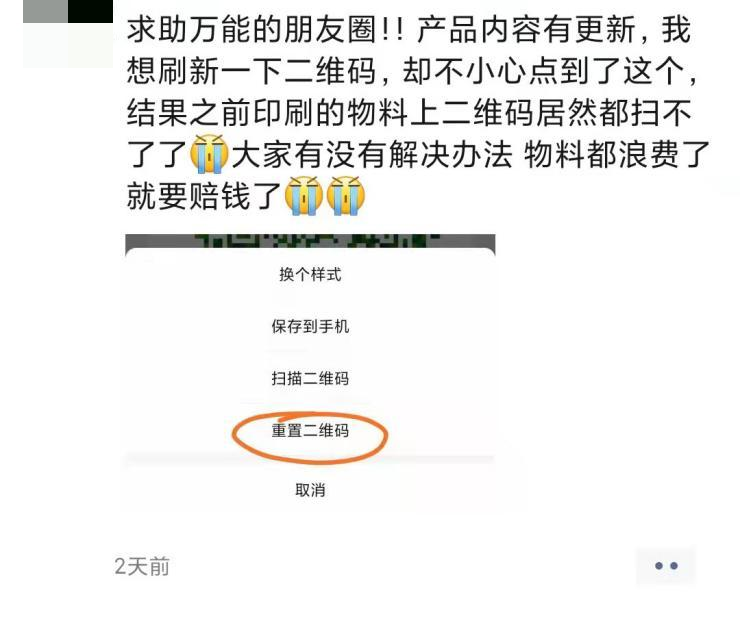 很多人是把设置二维码样式和重置二维码给搞混了。而这种情况,微信方暂无给出有效解决方法。也就是说,这位做市场营销的朋友是被“坑”了,只能自认倒霉。