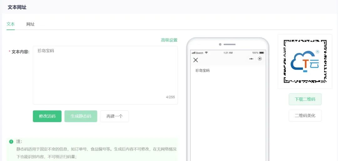 在文本网址码页面,企业可以将长文本及各种网站以二维码的形式展现出来。