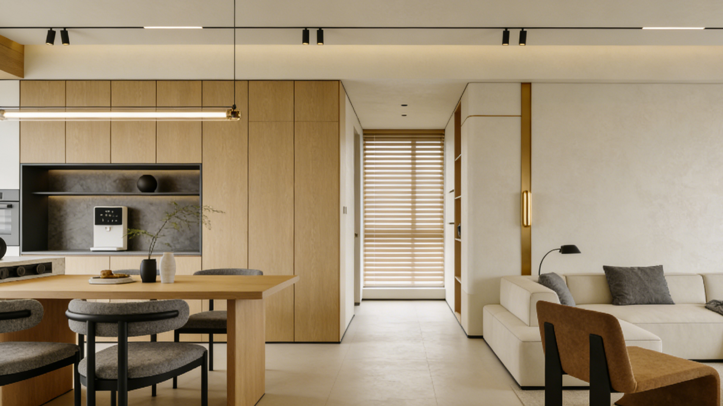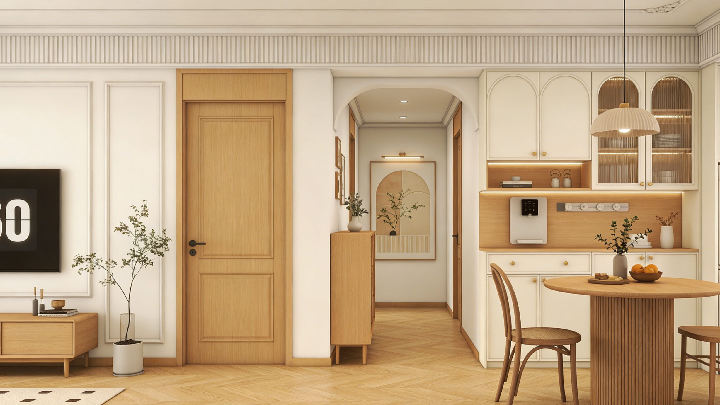 灯光设计是原木奶油风的“氛围灵魂”,而木门的色彩与质感也需要灯光的烘托。建议采用3000-3500K的暖光,通过无主灯设计搭配磁吸轨道灯、落地灯、灯带等多重光源,让光线均匀铺满空间,避免强光直射。当暖光洒在品桥原木木门上,木材的天然纹理会更显温润,与奶油色墙面相互映衬,整个空间的感瞬间拉满。
