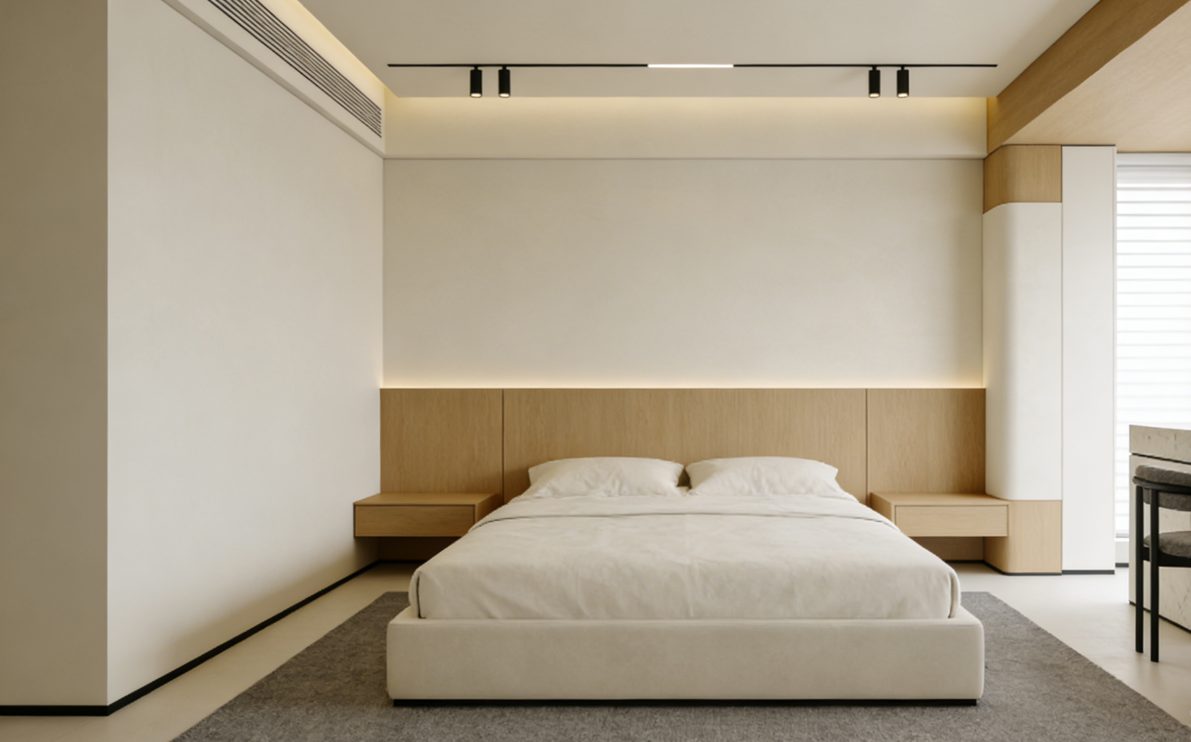 原木奶油风的主要,是“奶油底色”与“原木肌理”的和谐共生。不同于单一的白色或木色,它的色调选择更讲究低饱和的柔和感:墙面以米杏、奶咖、可可蛋奶等暖调为主,避免冷白带来的疏离感;地面则推荐浅橡、白蜡木等浅色木纹材质,竖纹地板能让空间更显高挑,山纹家具则增添自然韵味。这种70%奶油色基底+20%原木色搭配+10%跳色点缀的配色法则,既能保证空间的统一性,又能通过深浅变化营造层次,不会显得单调乏味。
