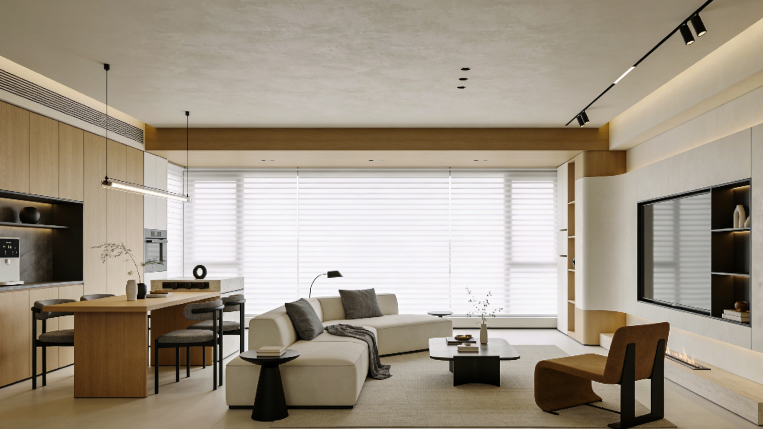 在材质与造型的选择上,原木奶油风始终围绕“松弛感”展开。硬装尽量简化,避免复杂造型,墙面可采用蛋壳光、稻草漆等艺术涂料增强肌理感,垭口、柜体转角做圆弧处理,弱化直角的生硬感。软装则偏爱天然材质,亚麻窗帘、藤编家具、棉麻沙发,每一件都自带温润质感;家具选择以“轻盈”为原则,细腿、悬浮款式更能提升空间通透度,避免大块头家具带来的压抑感。