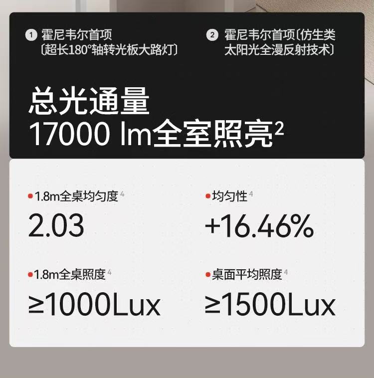 传统落地灯的 “点光源” 局限,在 02R02 这里被彻底打破:180° 轴转光板 + 21.4% 增大的灯头面积,让照明范围从 1.2 米延伸至 1.8 米,桌面照亮面积直接提升 125%。17000lm 的总光通量,足以覆盖 20㎡内的全屋空间;桌面平均照度≥1500Lux,均匀度低至 2.03,即便是 1.8 米的双人书桌,也能实现 “无死角、无明暗差” 的光线铺洒,彻底告别笔影、重影对用眼的干扰。