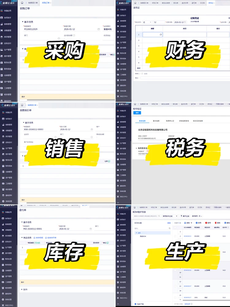 打开金蝶云星辰的界面,每个模块都精细对应着企业的日常痛点:采购模块能自动同步供应商订单与入库信息,不用再靠 Excel 来回导;销售模块实时追踪订单状态,客户问起发货进度,销售在系统里就能查到物流节点;库存模块设置了库存预警,当原材料低于安全线时自动提醒采购补货,避免断货风险;财务模块更懂中小企的 “算账难”,销售单生成后自动同步到财务账套,凭证一键生成,月底结账效率直接提升 3 倍;税务模块支持一键报税,自动匹配进项销项发票,减少了手工算税的出错率;生产模块则把 BOM 清单、工单进度、物料耗用全链路打通,车间主管在系统里就能看到每批产品的生产节点,不用再挨个车间跑。
