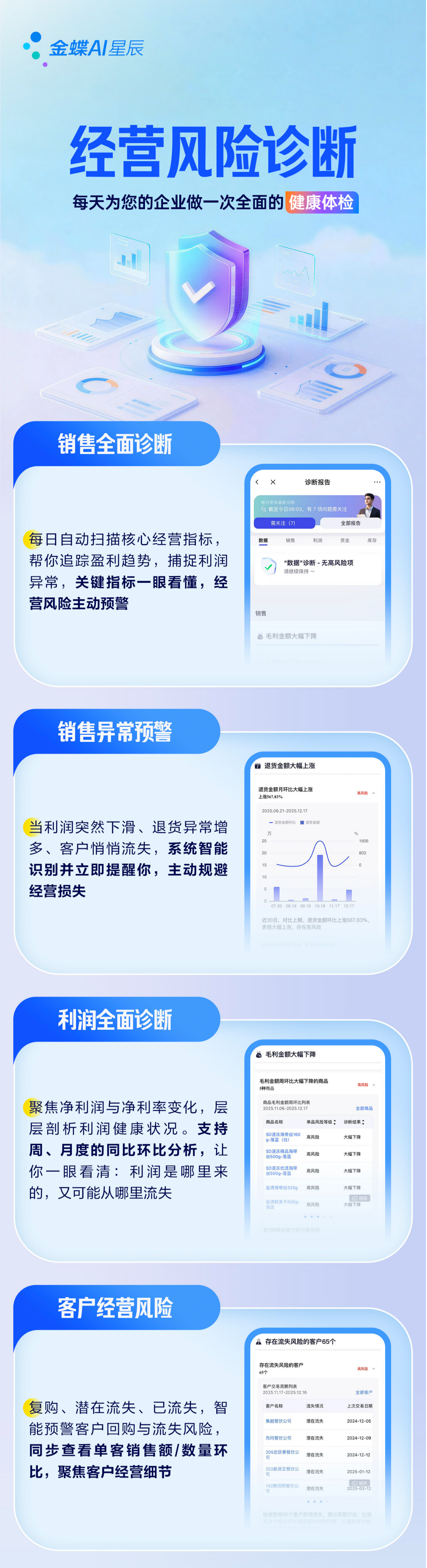 传统企业经营中,风险发现滞后是普遍痛点 —— 利润下滑了才复盘原因、客户流失了才察觉异动、退货量异常上涨了才排查问题,这些 “事后救火” 的应对方式往往导致损失扩大,甚至影响企业的持续经营。金蝶 AI 星辰推出 “经营风险诊断” 方案,以 “每日各方面体检” 的模式,通过四大主要模块实现风险的主动预警与精细诊断,让企业从 “被动应对” 转向 “主动防控”。