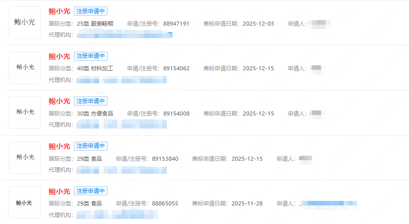 就在鲍小光事业蒸蒸日上之际,一个潜在危机悄然浮现。据查询,“鲍小光”商标已被多家公司及自然人申请注册,这些申请集中在2025年底,国际分类包括方便食品、服装鞋帽等。