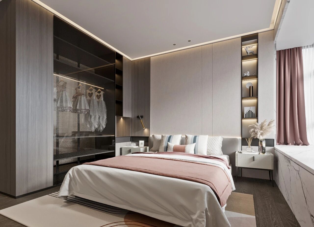 以柔粉色床品为主角的次卧,通过浅咖色木饰面柜体与金属线条的点缀,将少女感与轻奢感完美平衡。整面墙的开放式衣柜兼具展示与收纳功能,窗边的大理石台面则为空间增添了精致细节。